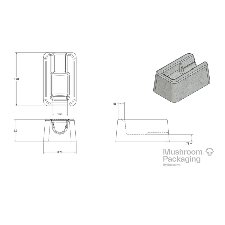 Mushroom® Packaging tincture inserts are fully home-compostable and will return to the soil in 45 days. This packaging is best utilized as an insert in a shipping box to protect ROUND glass tincture bottles. This will hold a square 1 oz bottle. See the dimension drawing for details.